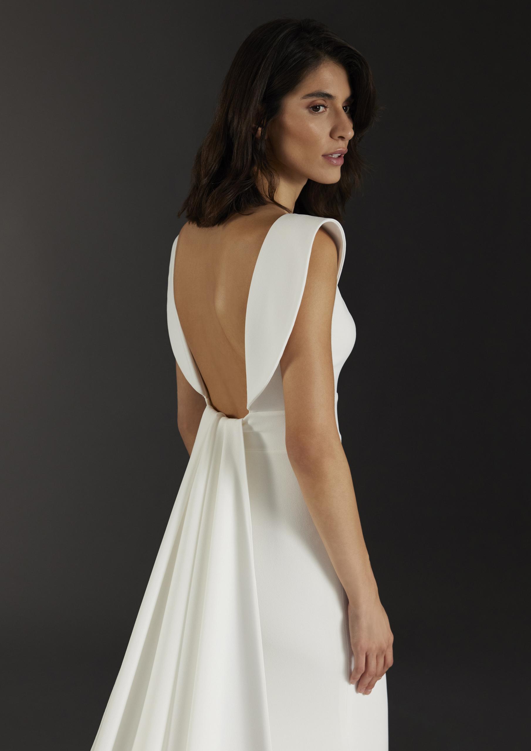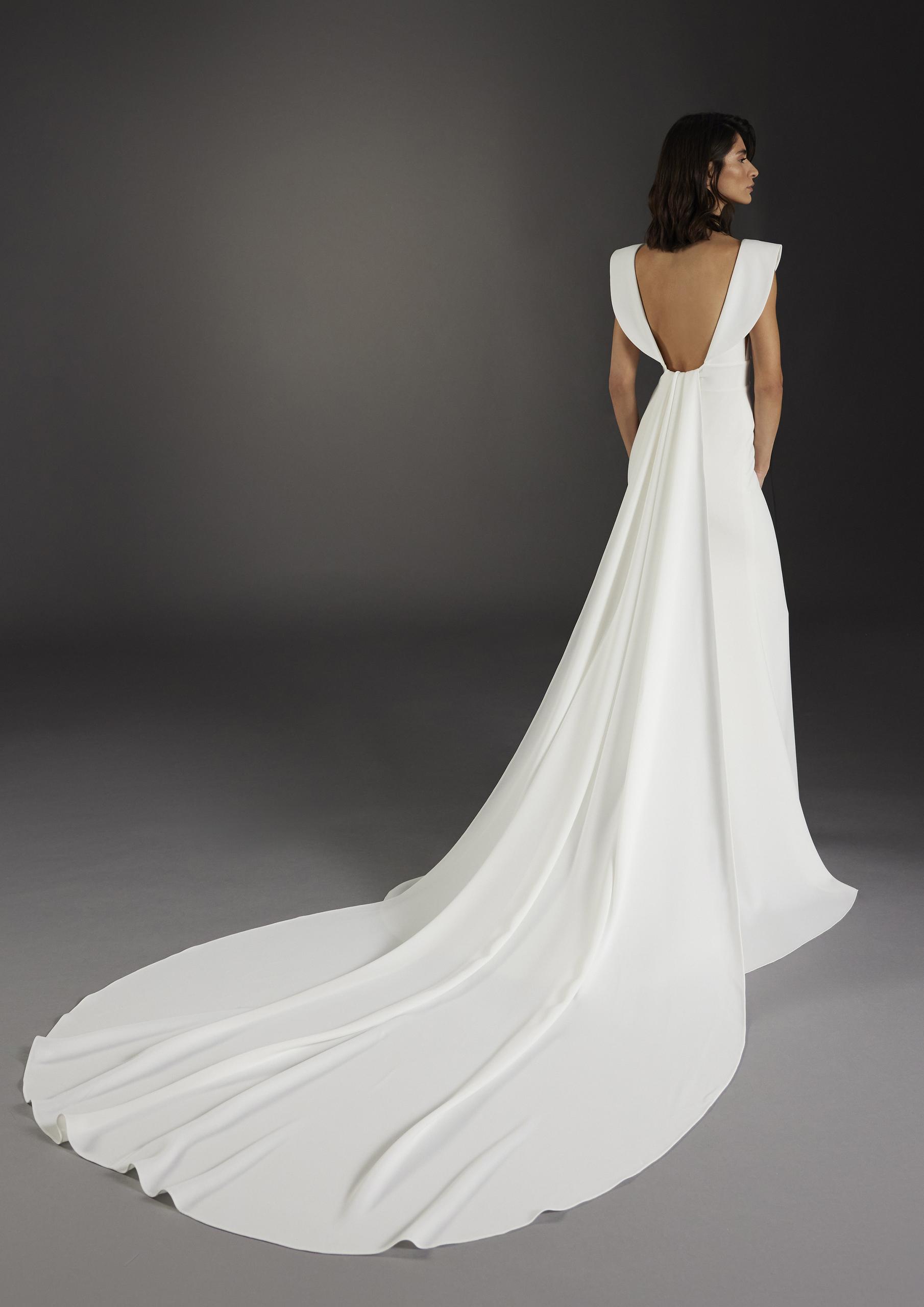 Condal by Atelier Pronovias - a fitted wedding dress with V-neckline and open back. Featuring unique capped sleeves and a detachable train. Available in Jacquard or Crepe fabric. Shop sample is in Jacquard.
