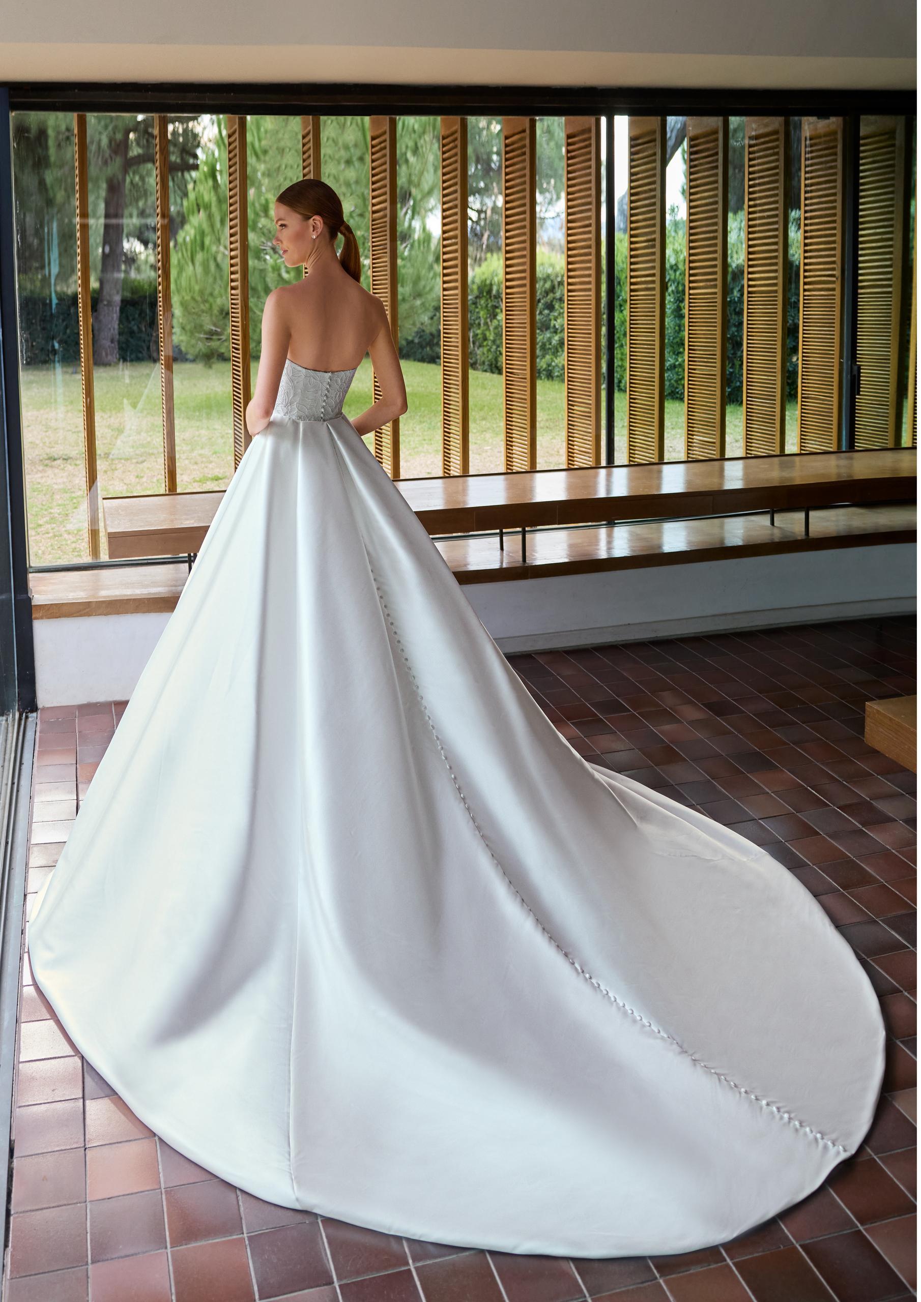 Hafsa by Pronovias - a column cut, strapless wedding dress in a solid lace fabric. Featuring an optional mikado overskirt. Ideal for the bride who wants 2 looks for her wedding day.