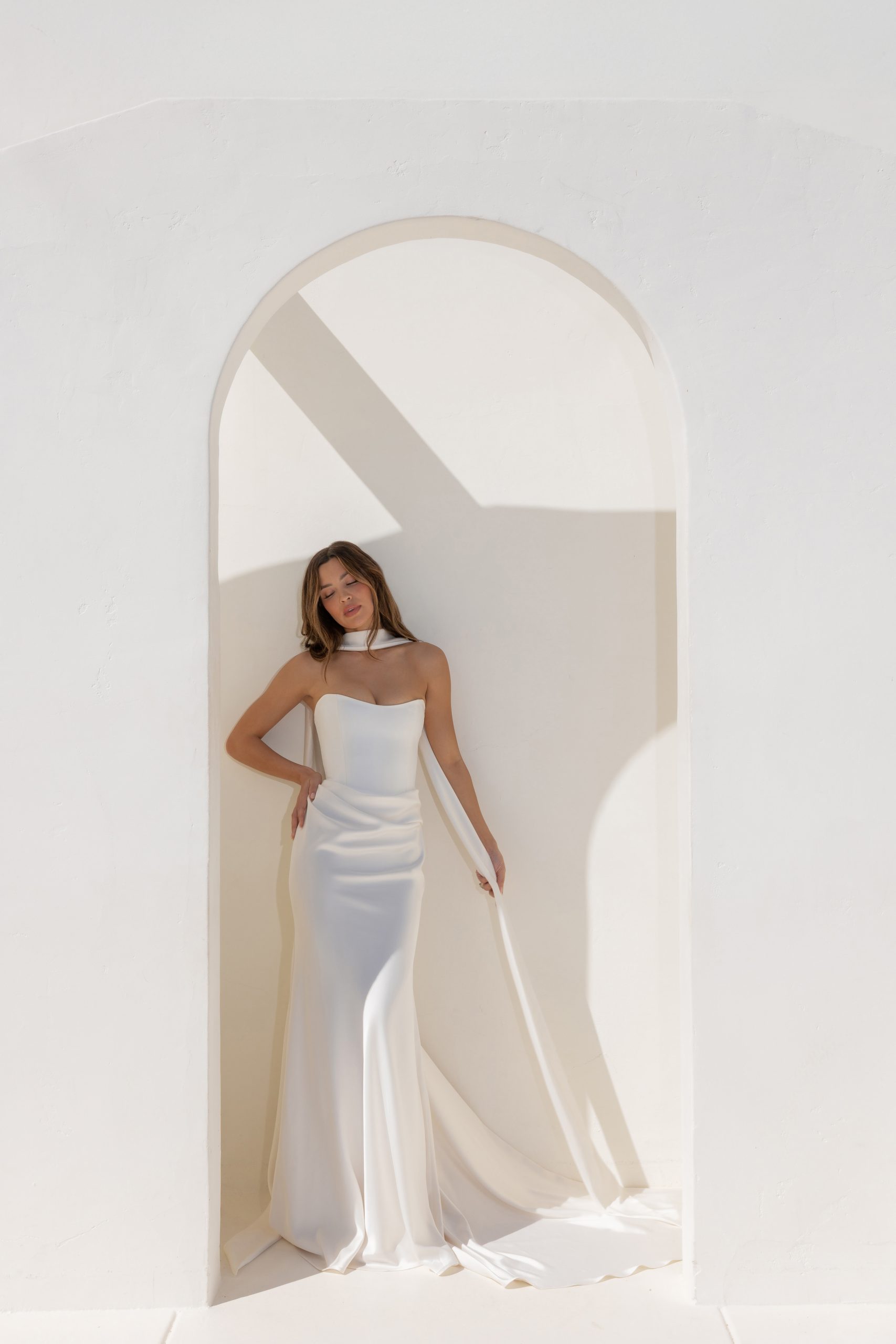 Kaia by Alyssa Kristin - a strapless wedding dress with a structured mikado bodice and a soft satin skirt which features light ruching detail. Neck scarf sold separately.