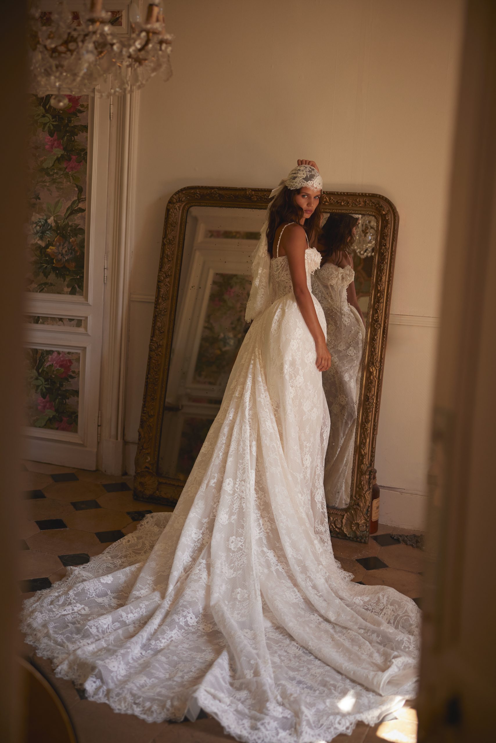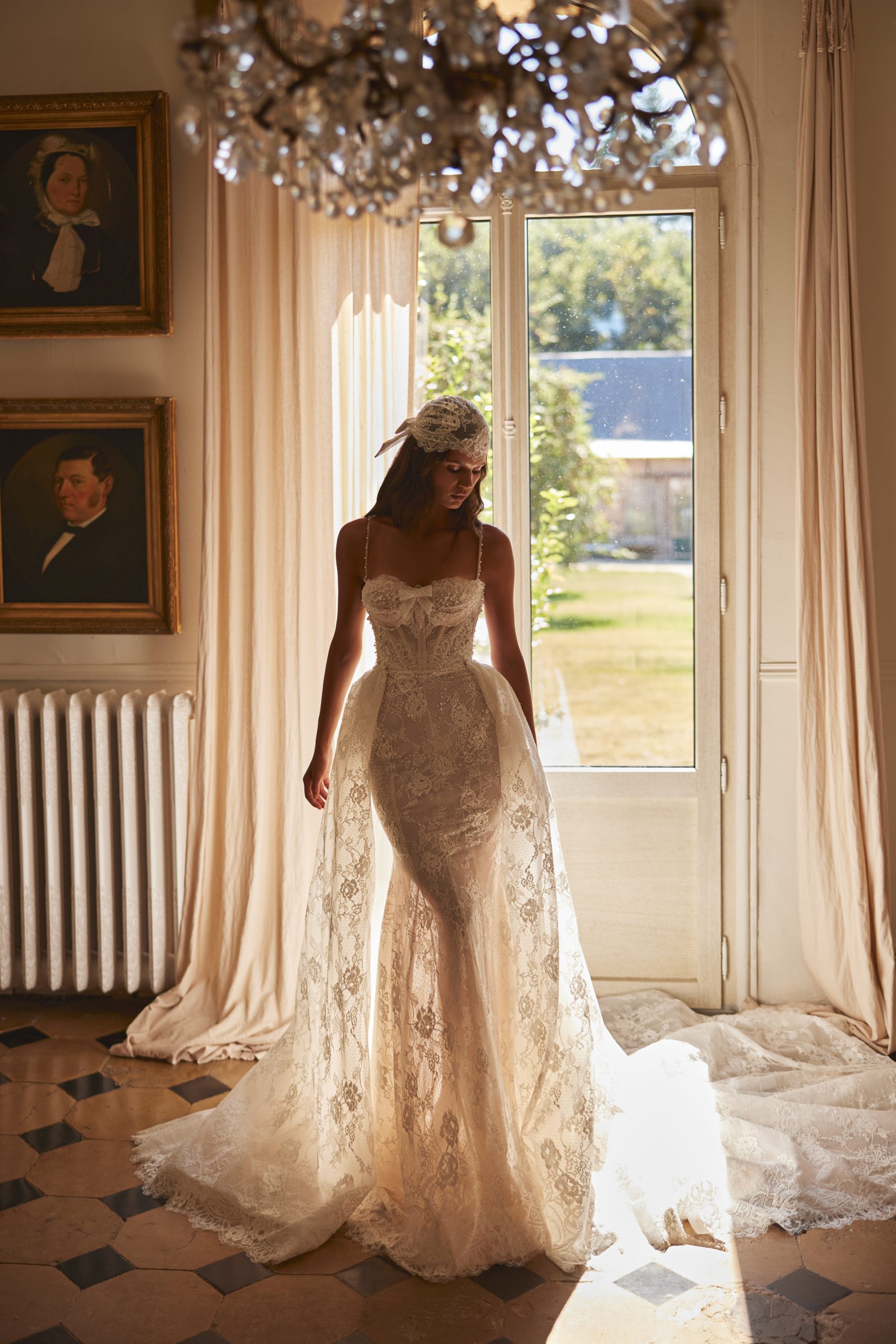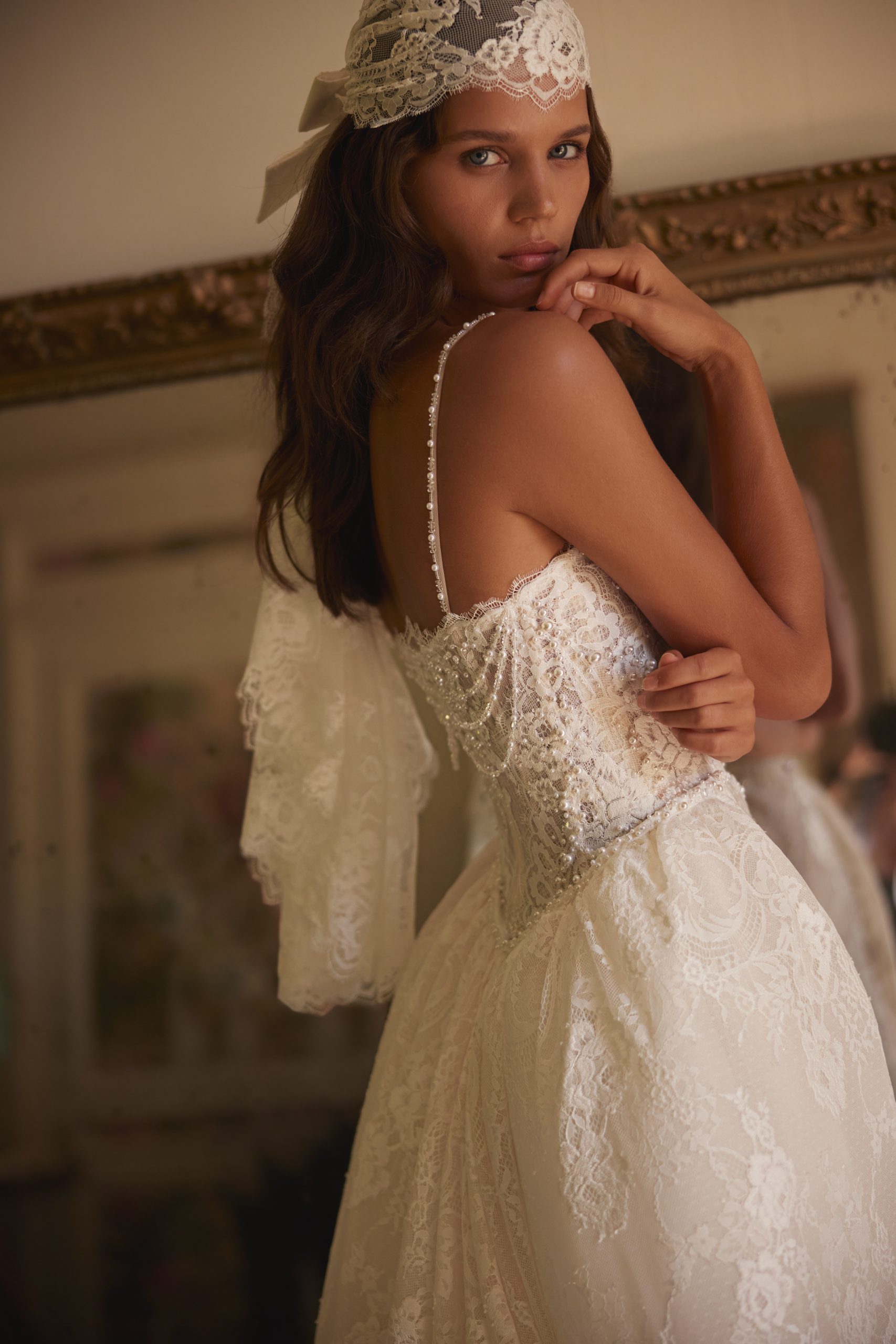 Lumiere by Luce Sposa - a fitted lace wedding dress with beading details and fine beaded straps. Add the matching lace overskirt to complete your look. Also available, a matching high neck lace jacket.