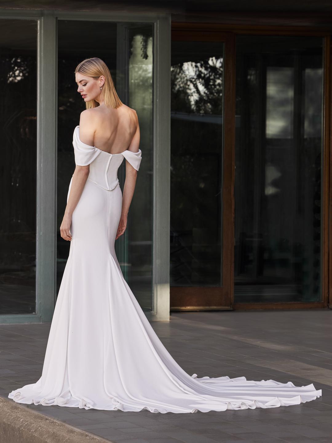 Polenia by Pronovias  - a crepe, fit and flare wedding dress with sculpted basque bodice and detachable off the shoulder straps.