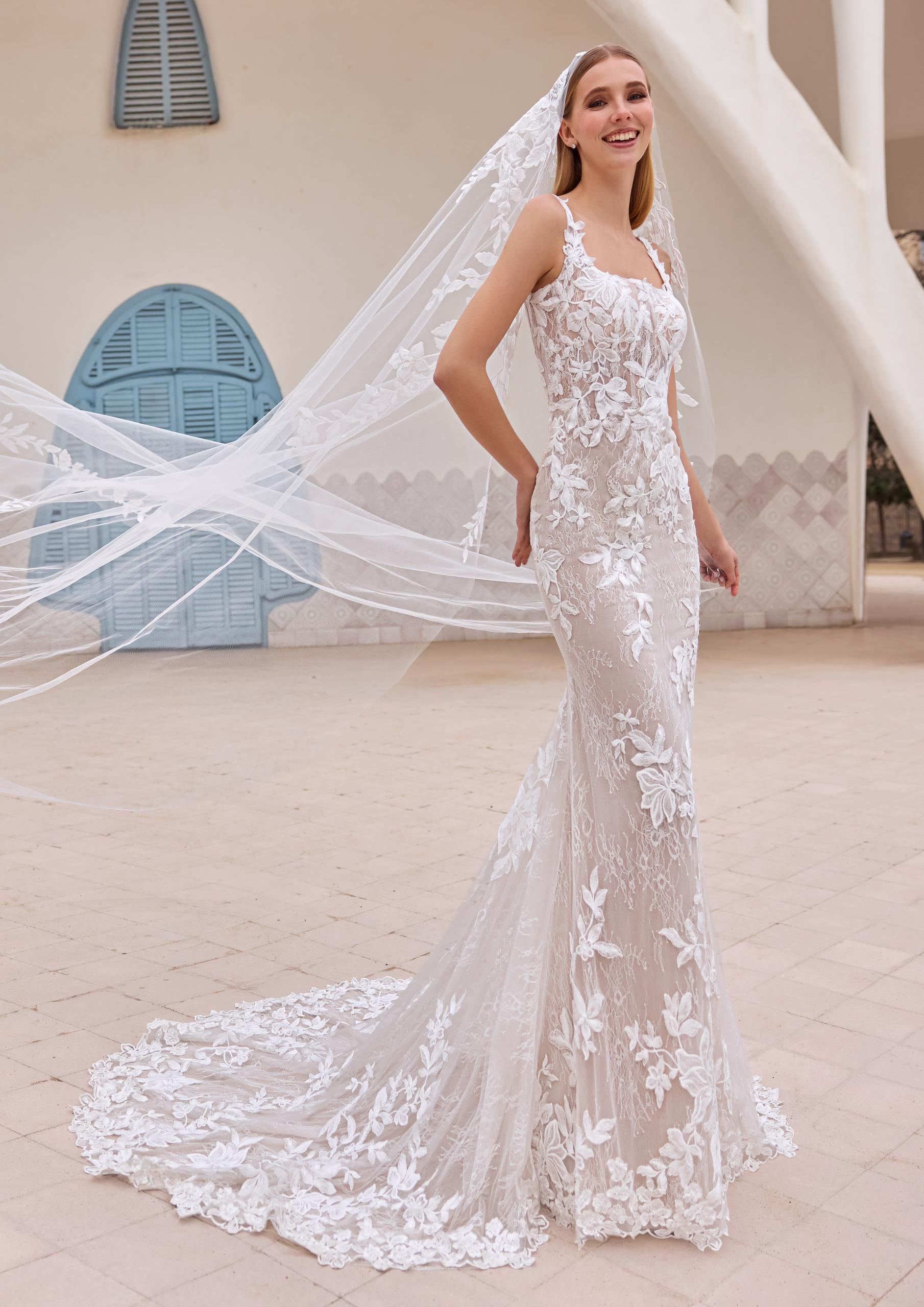 Zeala by Pronovias - a fitted, lace wedding dress with square neckline. Featuring a soft chantilly lace with bold floral lace appliqués and covered buttons along the zip. (shop sample is lined in all ivory. picture is unlined bodice with nude lining in skirt)